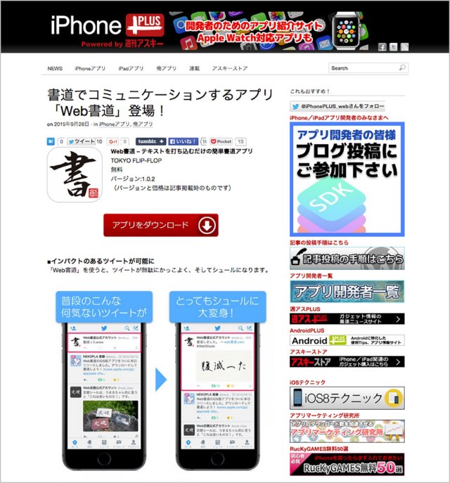 作成者: TOKYO FLIP-FLOP 2015年9月26日 週アス iPhone PlusにWeb書道が掲載 書道でコミュニケーションするアプリ「Web書道」登場! 詳しくは週アス iPhone Plusで→ 共有: クリックして X で共有 (新しいウィンドウで開きます) X Facebook で共有するにはクリックしてください (新しいウィンドウで開きます) Facebook 関連