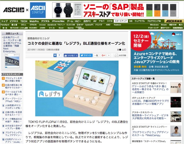 作成者: TOKYO FLIP-FLOP 2016年11月9日 ASCII.jpにレジプラ通信仕様オープン化が掲載 ASCII.jpにレジプラ通信仕様オープン化の記事が掲載されました。 詳しくはASCII.jpで→ 共有: クリックして X で共有 (新しいウィンドウで開きます) X Facebook で共有するにはクリックしてください (新しいウィンドウで開きます) Facebook 関連