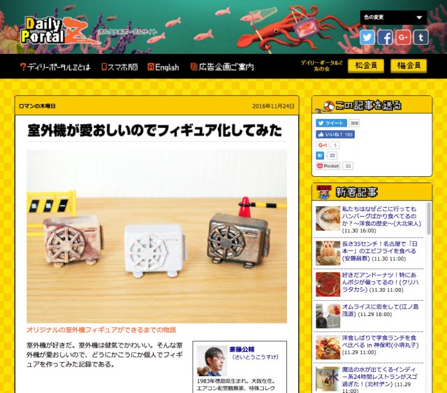 作成者: TOKYO FLIP-FLOP 2016年11月24日 DPZに室外機フィギュアの記事が掲載 デイリーポータルZにエアコン室外機フィギュアの記事が掲載されました。2年がかりの感動的な製品開発秘話になっております。 詳しくはデイリーポータルZで→ 共有: クリックして X で共有 (新しいウィンドウで開きます) X Facebook で共有するにはクリックしてください (新しいウィンドウで開きます) Facebook 関連
