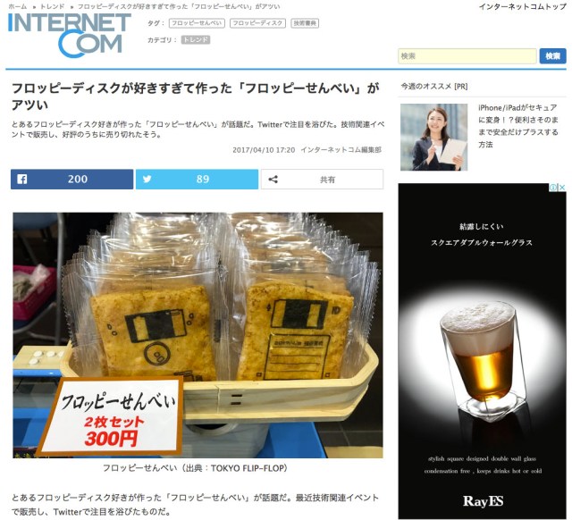 作成者: TOKYO FLIP-FLOP 2017年4月10日 フロッピーせんべいがインターネットコムに掲載 インターネットコムにTwitterで話題の「フロッピーせんべい」として紹介されました。 詳細はインターネットコムで→ 共有: クリックして X で共有 (新しいウィンドウで開きます) X Facebook で共有するにはクリックしてください (新しいウィンドウで開きます) Facebook 関連