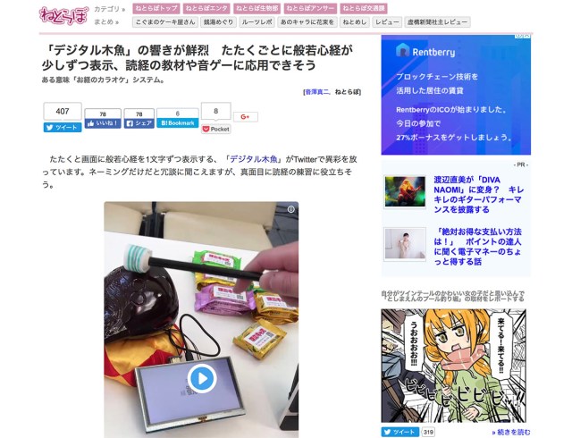 作成者: TOKYO FLIP-FLOP 2017年12月14日 ねとらぼにデジタル木魚が掲載 たたくと画面に般若心経を1文字ずつ表示する、「デジタル木魚」がねとらぼに掲載されました。 詳細はねとらぼで→ 共有: クリックして X で共有 (新しいウィンドウで開きます) X Facebook で共有するにはクリックしてください (新しいウィンドウで開きます) Facebook 関連