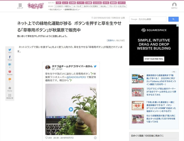 作成者: TOKYO FLIP-FLOP 2019年6月10日 ねとらぼにワンボタンキーボードが掲載 ネット上での緑地化運動が捗る ボタンを押すと草を生やせる「草専用ボタン」として「ワンボタンキーボード」がねとらぼに掲載されました。 詳細はねとらぼで→ 共有: クリックして X で共有 (新しいウィンドウで開きます) X Facebook で共有するにはクリックしてください (新しいウィンドウで開きます) Facebook 関連